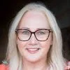 Jude Jennison sitting on a stone bridge with trees behind her with sunlight coming through them